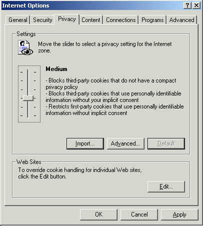 Cookies are used to temporarily store information on your computer for use by the website, the amount of information is typically small, like a single ID number. Many sites need cookies to be enabled before they can function correctly. Symptoms of cookie related problems can be a site repeatedly sending you to the wrong page, refusing your attempts to log in or losing track of information about you in some other way. For more information about what cookies are you can read Microsoft's explanation. For a detailed discussion of cookies see CookieCentral a popular website on the subject. If you aren't sure if you have cookies enabled or not you can try Weblink's cookie test. To turn cookies on in Internet Explorer 6: